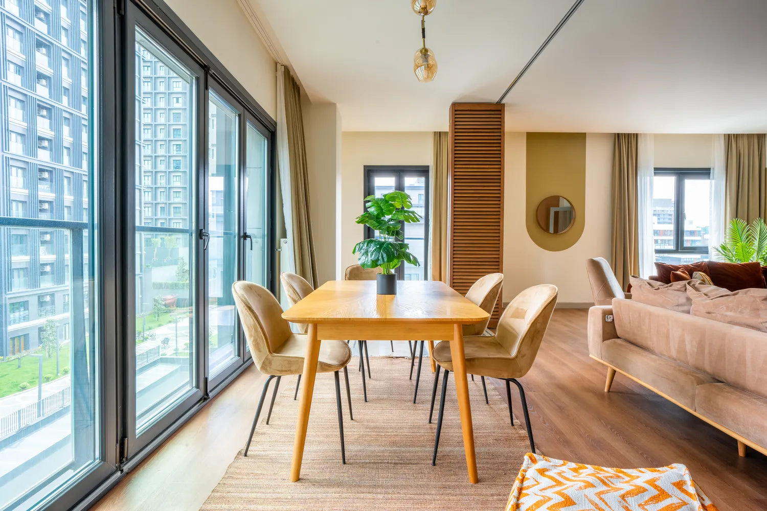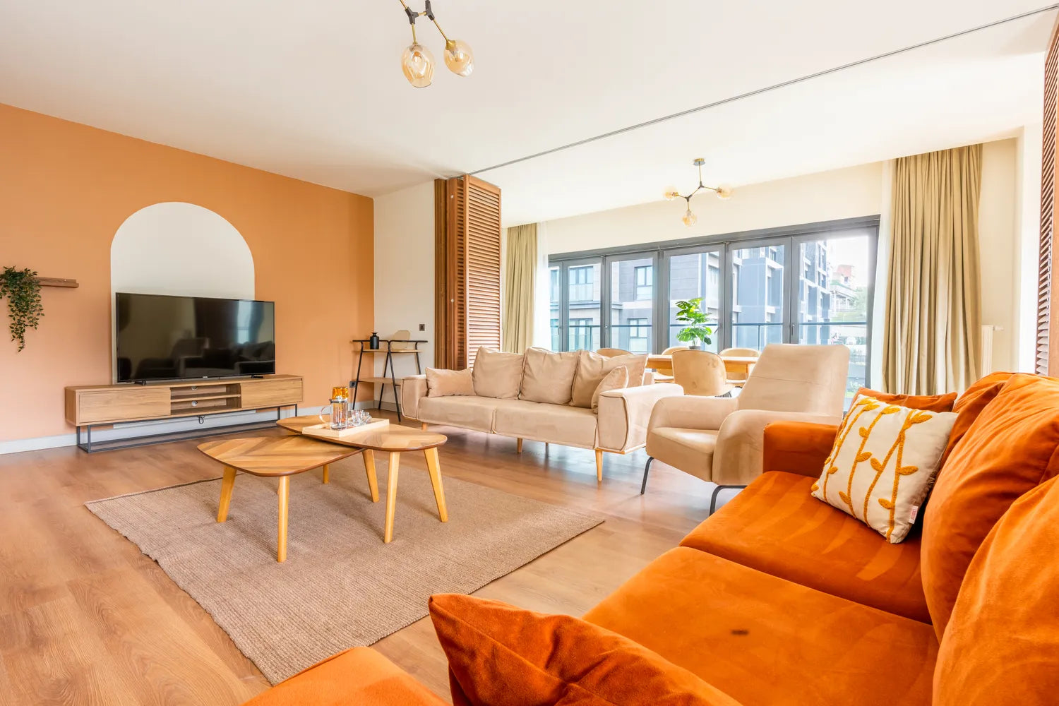 Sizin için özenle tasarlanmış, Kağıthane, Seyrantepe'deki sıcak ve modern dört yatak odalı bu geniş dairede hemen yaşamaya başlamanız için her şey hazır. Dairede rahat bir uyku için ortopedik yataklar, kaliteli uyku tekstili ürünleri, keyifle yemek yapmanızı sağlayacak tam donanımlı bir mutfak, özenle tasarlanmış mobilyalar, akıllı televizyona sahip ferah bir salon ve yüksek hızlı Wi-Fi bağlantısı da mevcut. Bu özelliklerle beraber dairede ebeveyn banyosu ve açık havanın keyfini çıkarabileceğiniz bir balkon da var. Bu daire imkanları arasında yürüyüş alanı, park, kapalı yüzme havuzu, hamam, sauna, spor salonu, çocuk oyun alanı, açık ve kapalı otopark da bulunuyor. Ayrıca çevredeki restoranlar, alışveriş merkezleri ve eğlence mekanlarıyla da çevrili olması, size şehir hayatının tadını çıkarma fırsatı veriyor. Dairelerimizde kullanılan mobilyalar, BLEND+R markasına aittir.